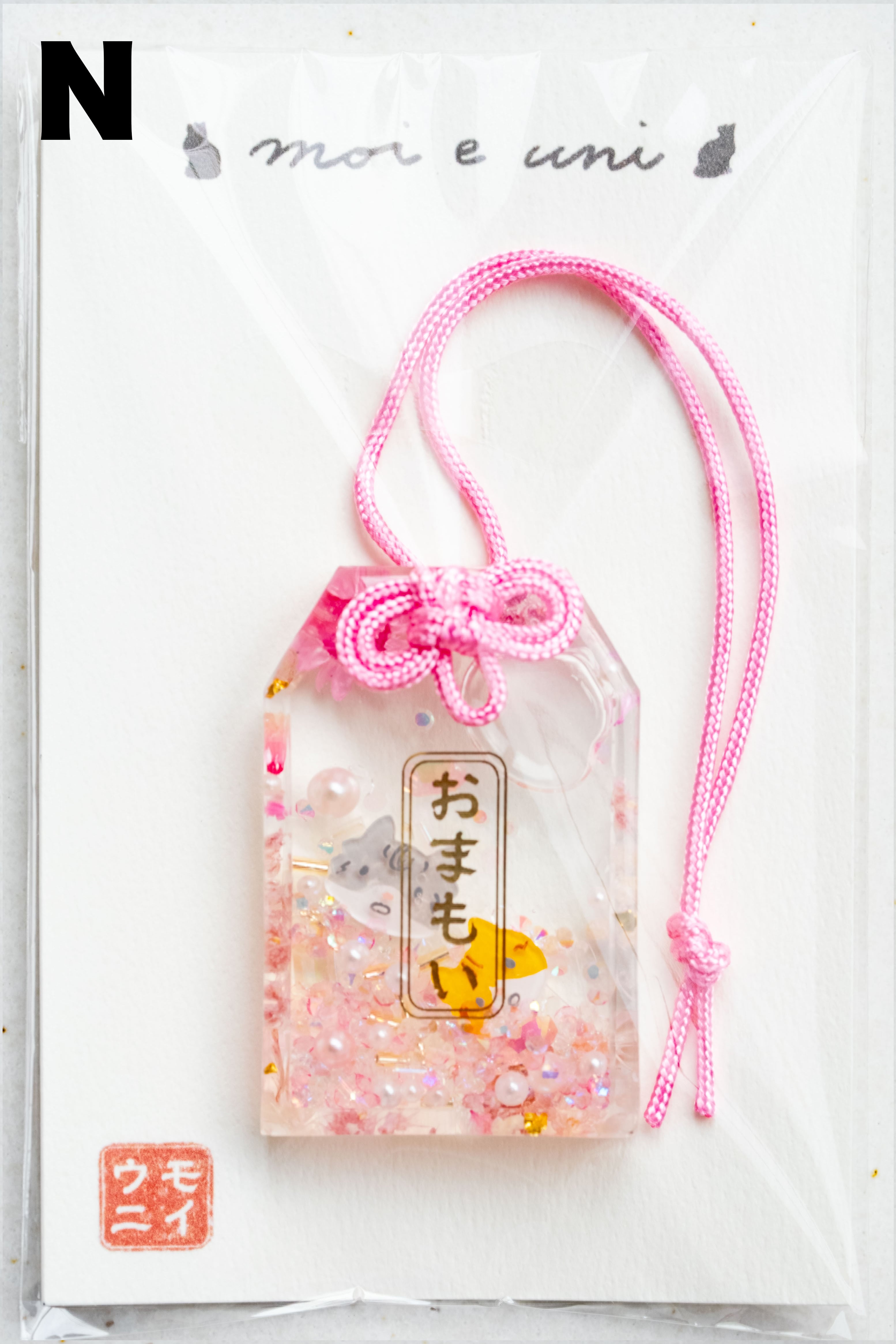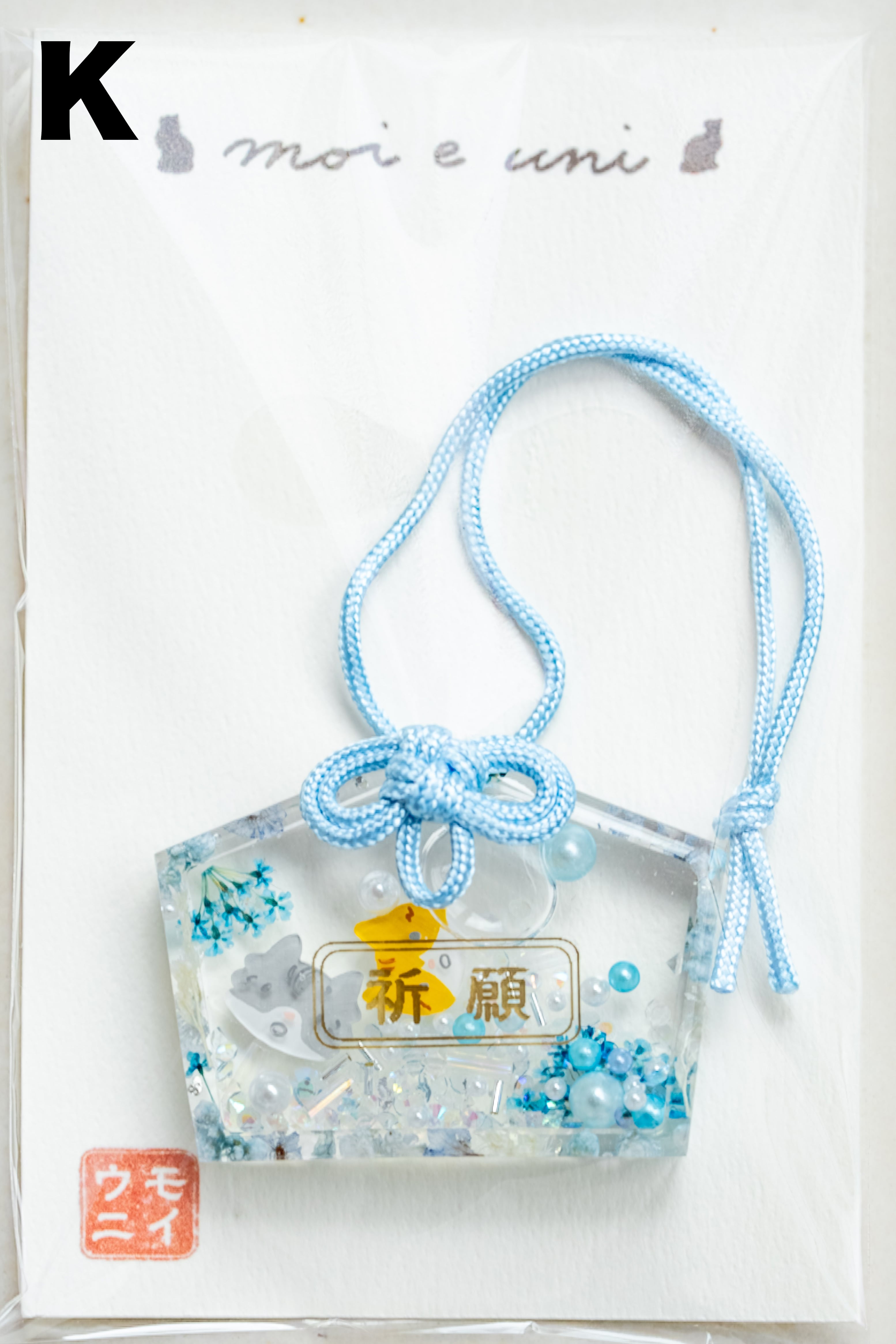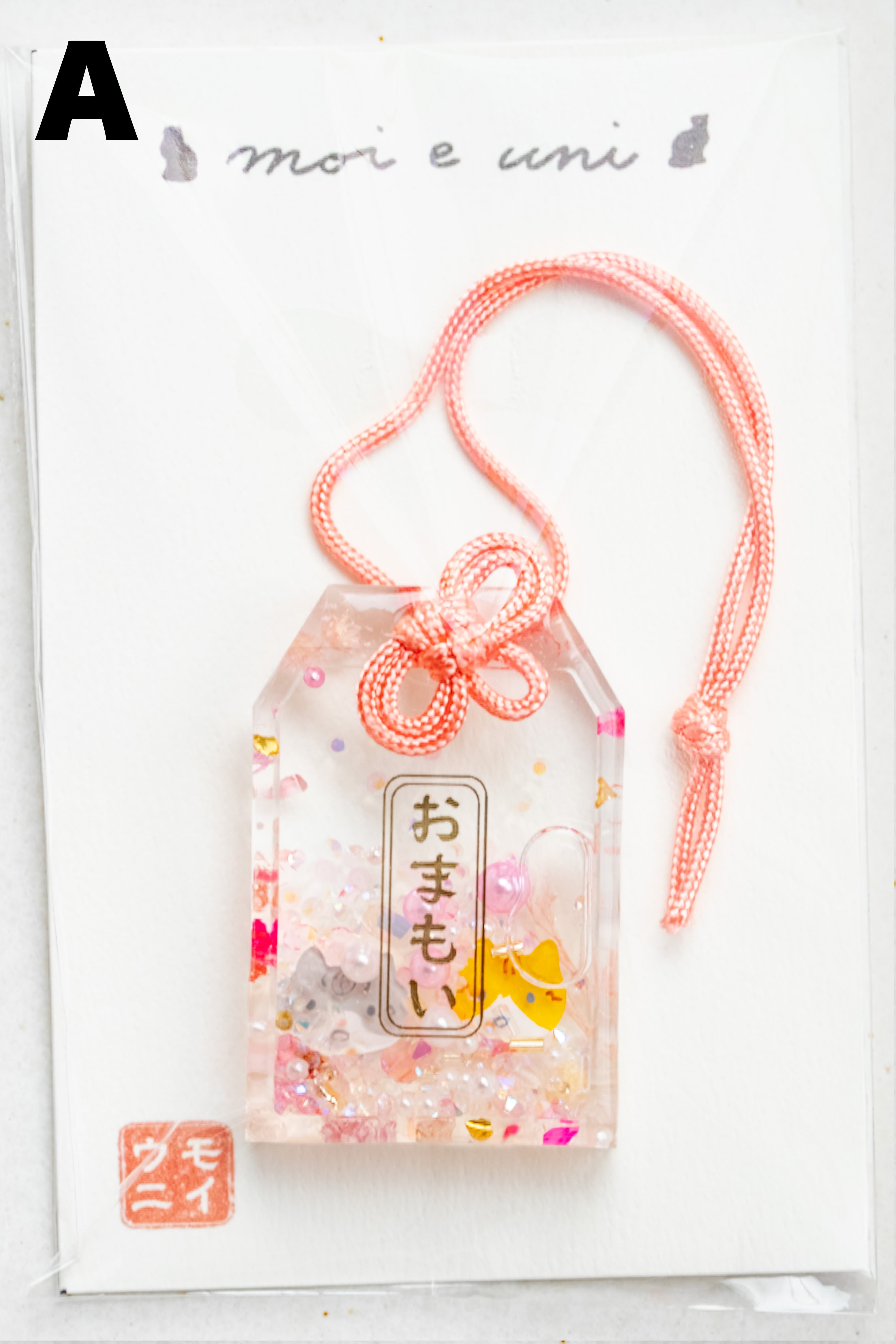 キラキラしたビーズとともに浮かぶ、病を克服した奇跡のモイ(サバシロ猫)と、太陽のように明るいウニ(茶シロ猫)がそっとあなたや大切な方に寄り添います。