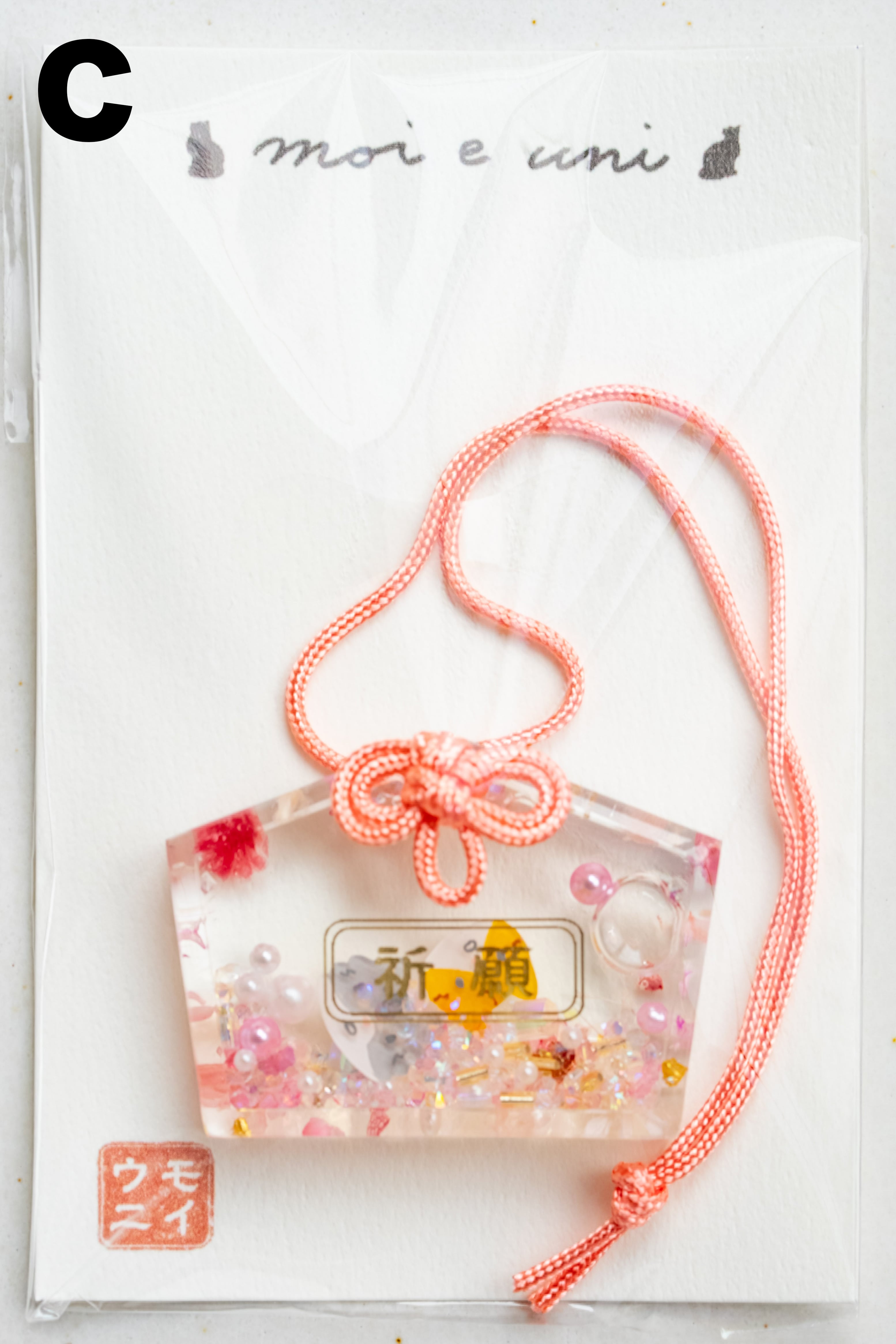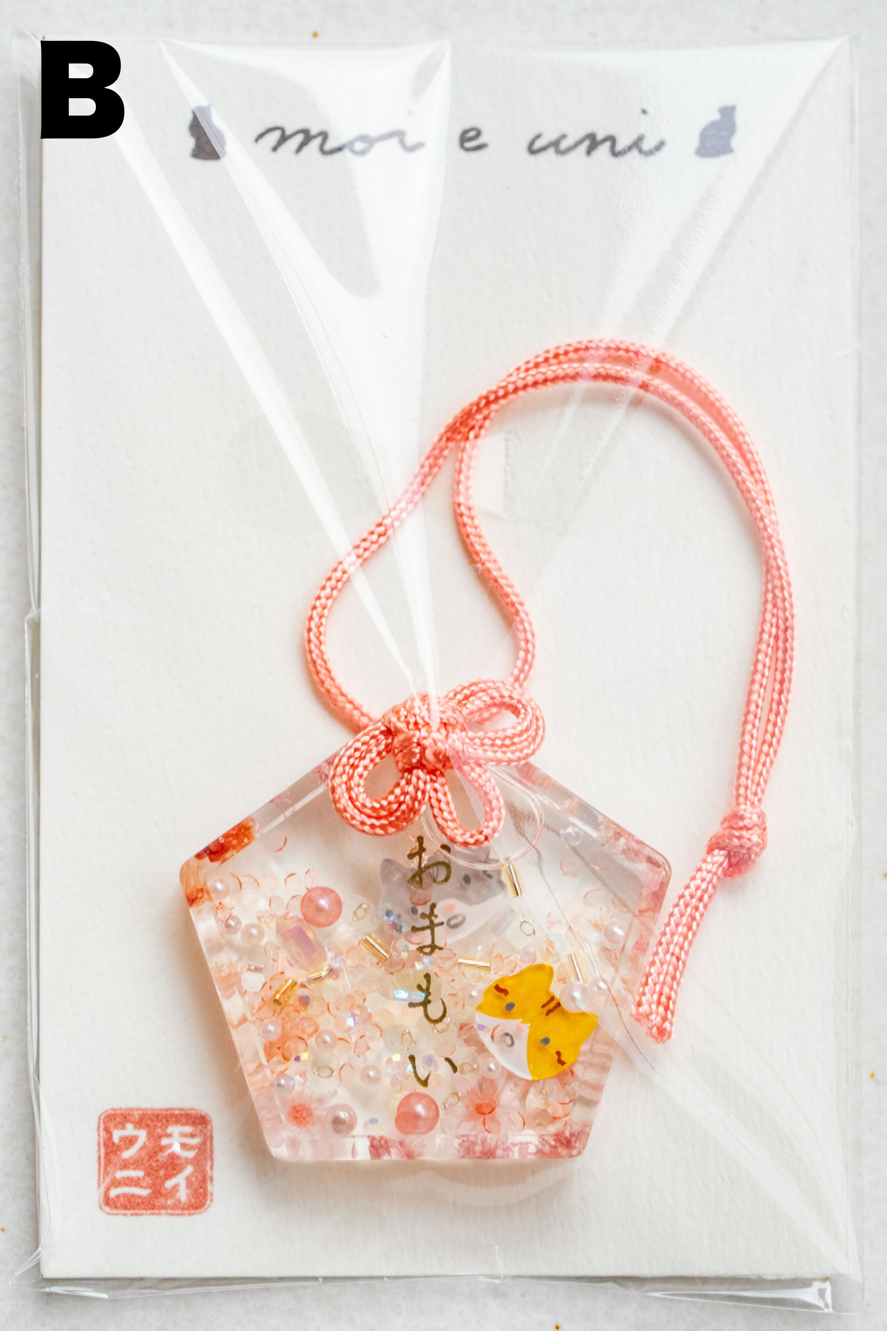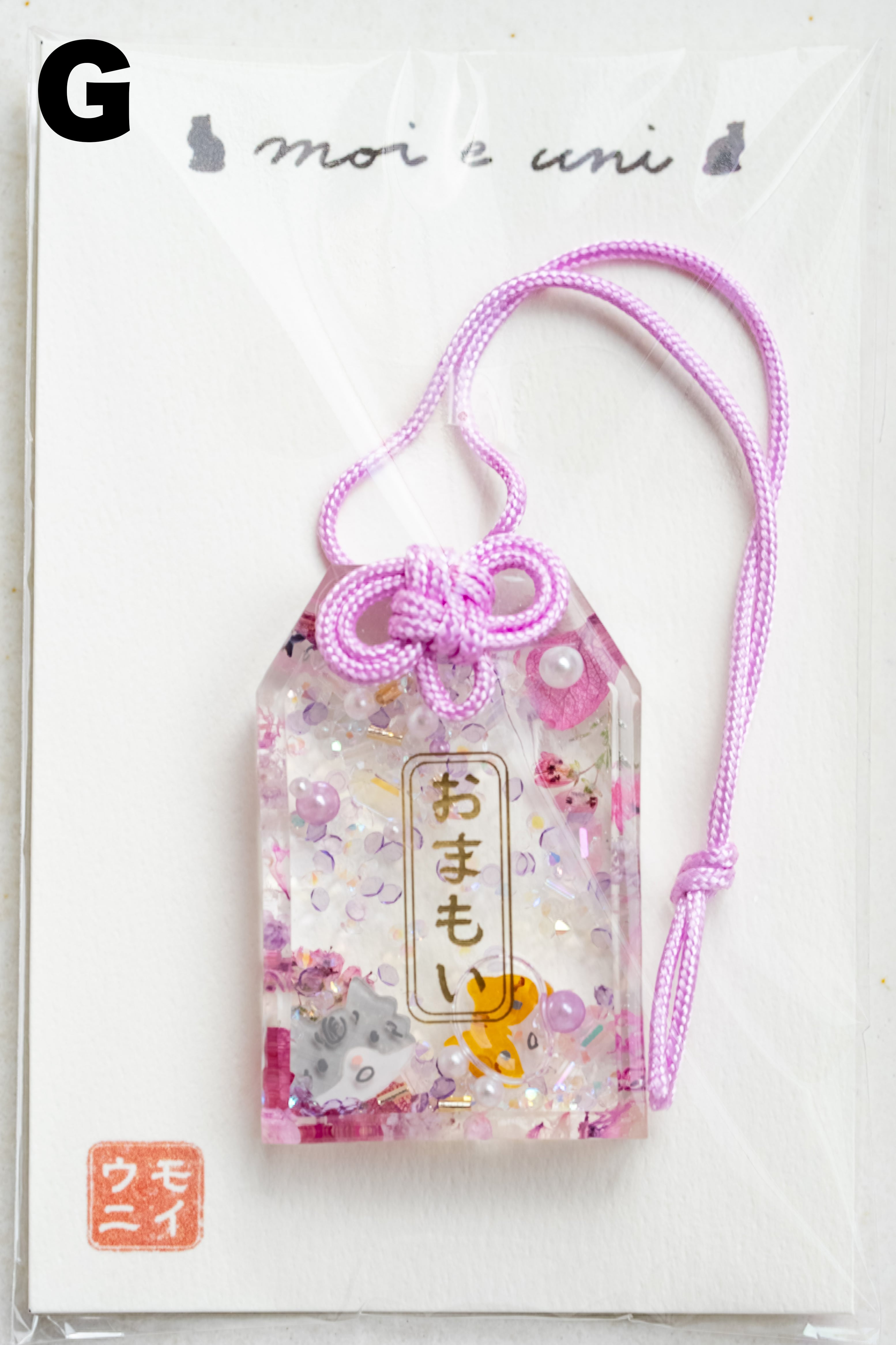 キラキラしたビーズとともに浮かぶ、病を克服した奇跡のモイ(サバシロ猫)と、太陽のように明るいウニ(茶シロ猫)がそっとあなたや大切な方に寄り添います。