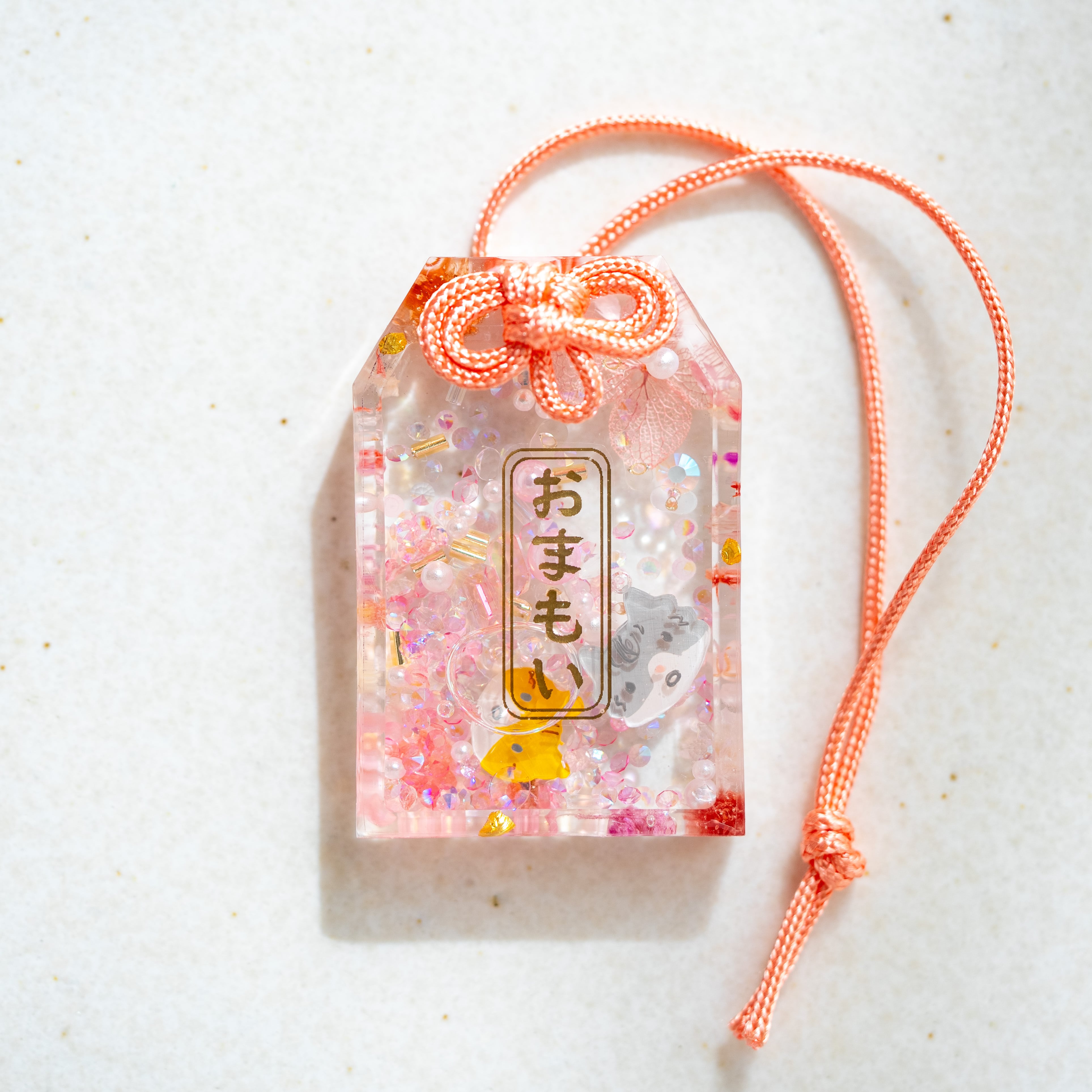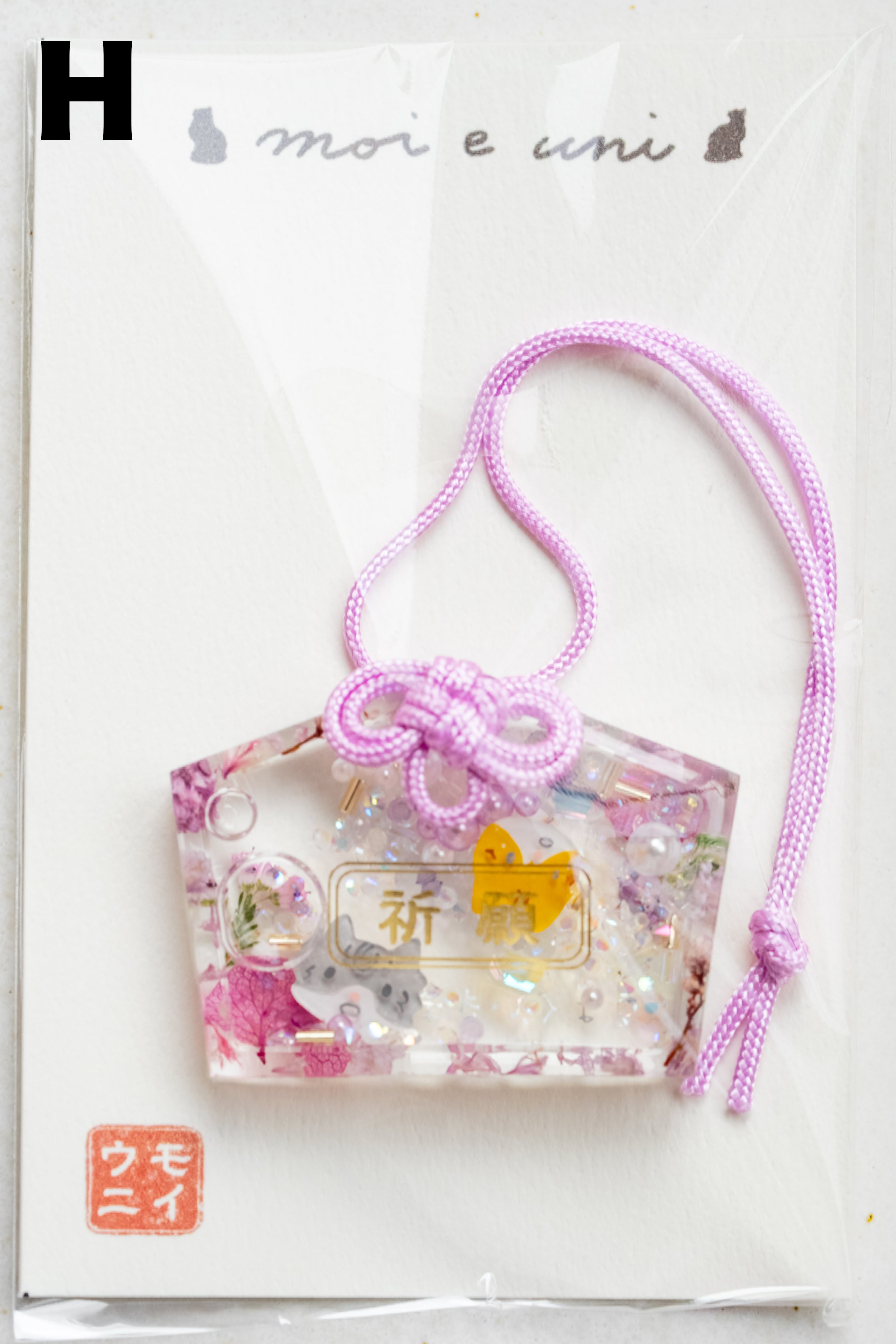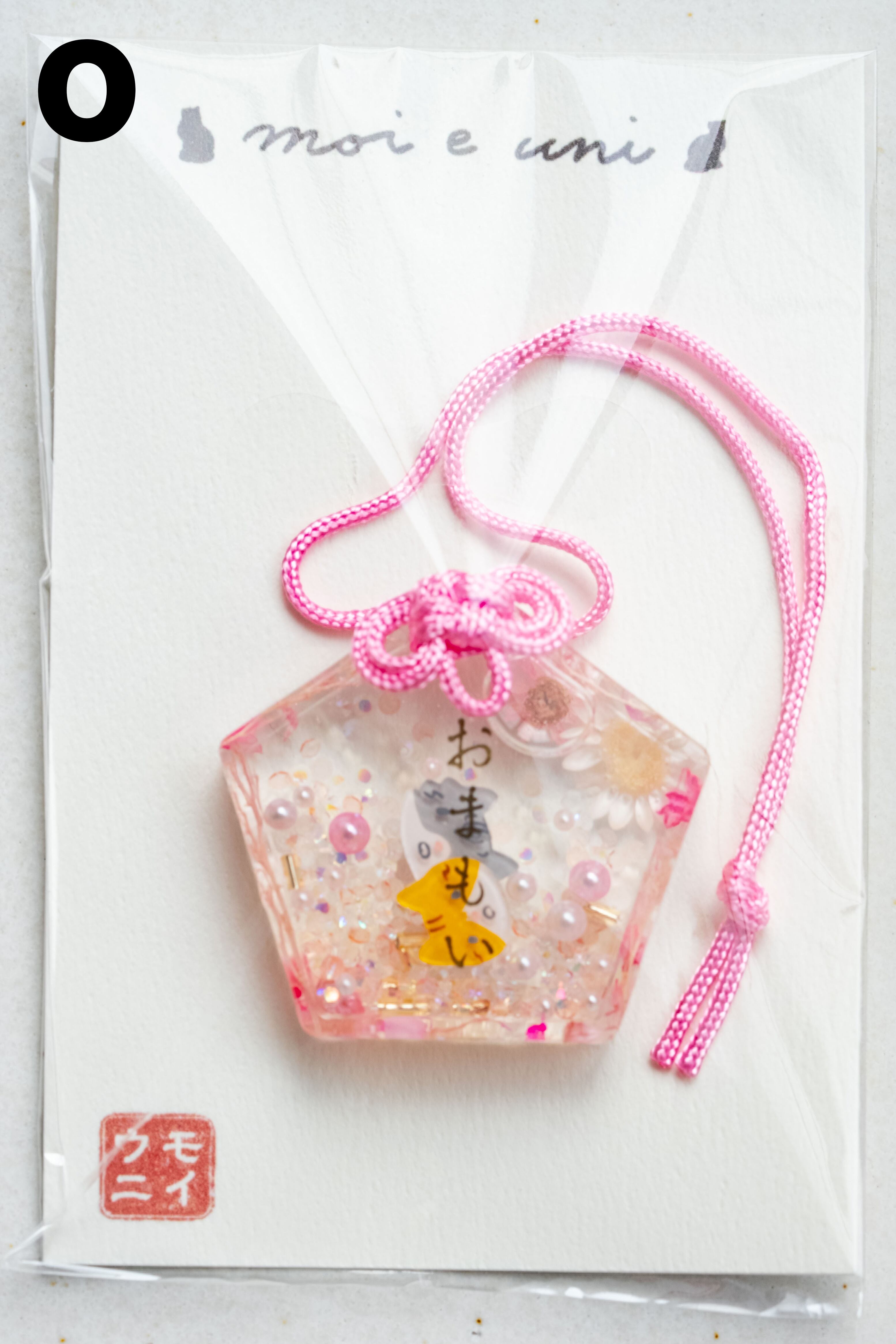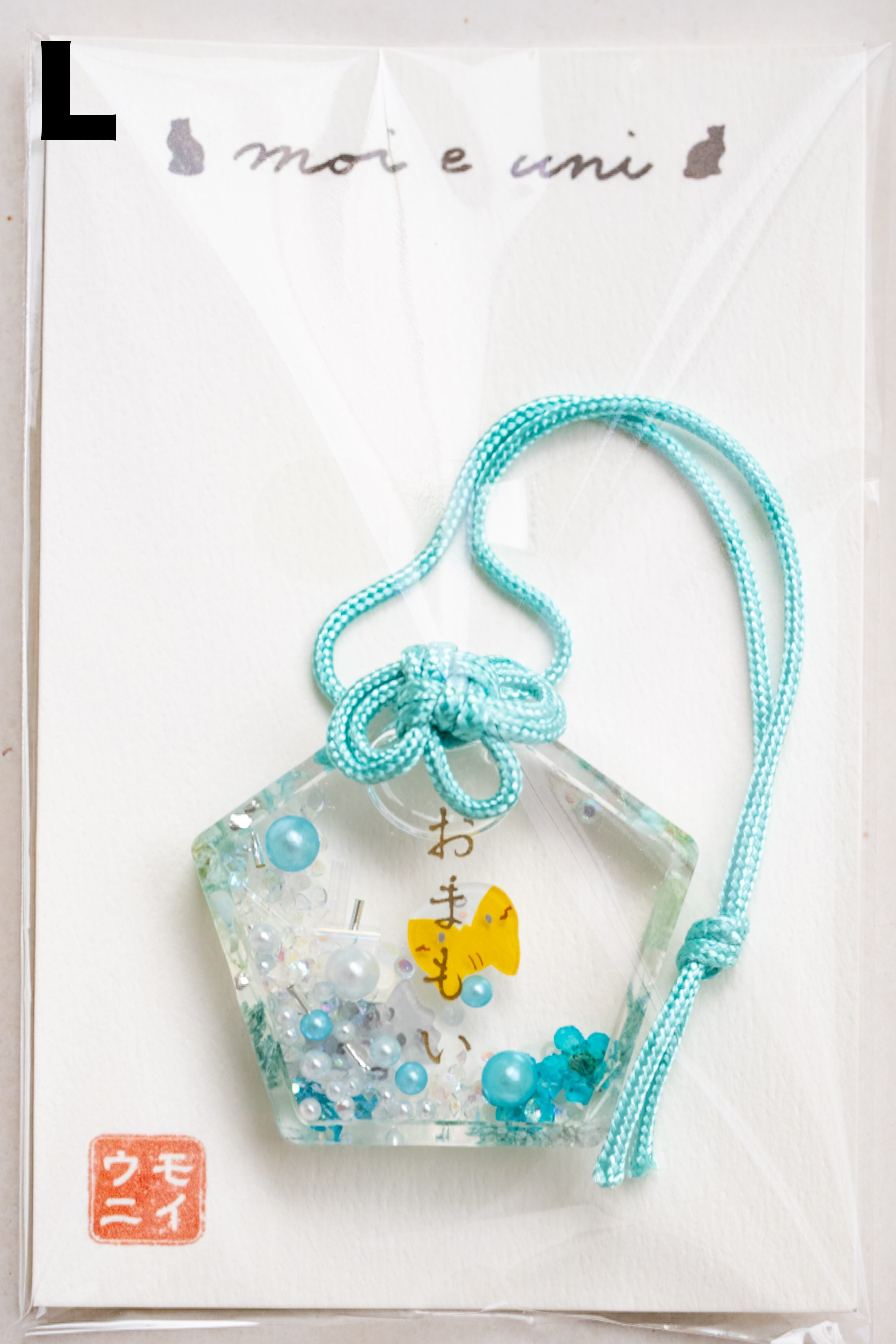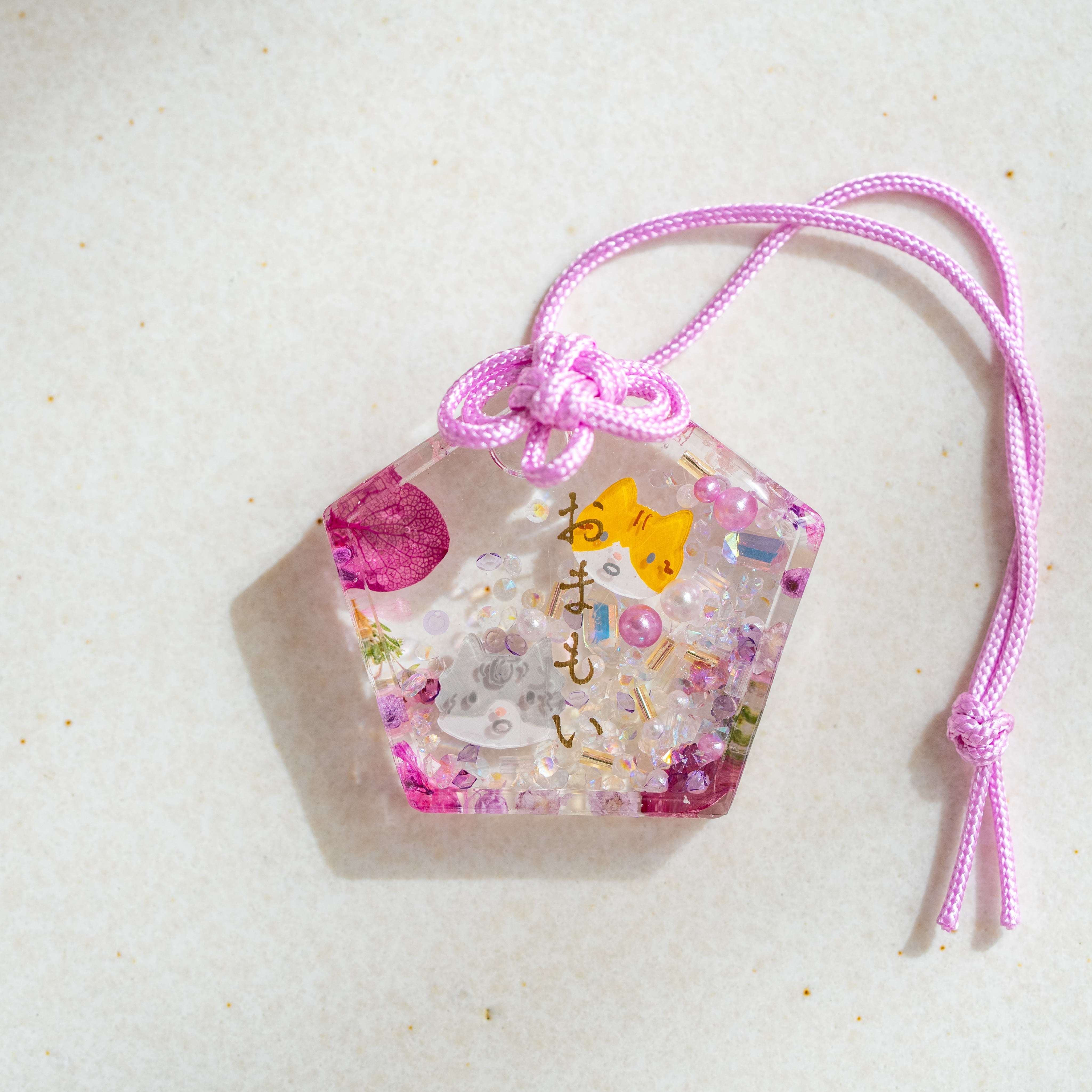 ハンドメイドのお守り、絵馬型チャームです。