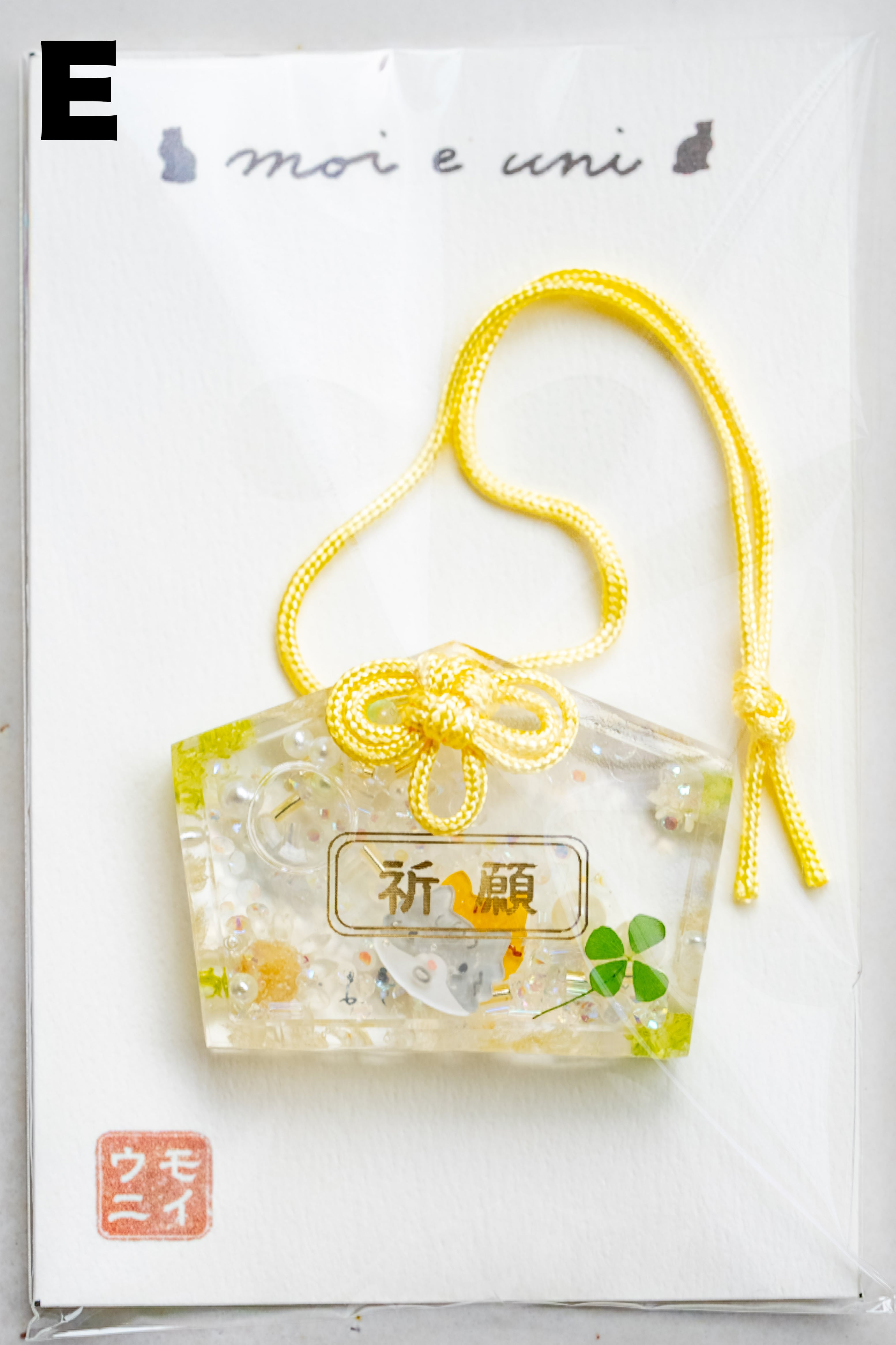 パステルイエローとうぐいす色のおまもいには四葉のクローバーも入っています。