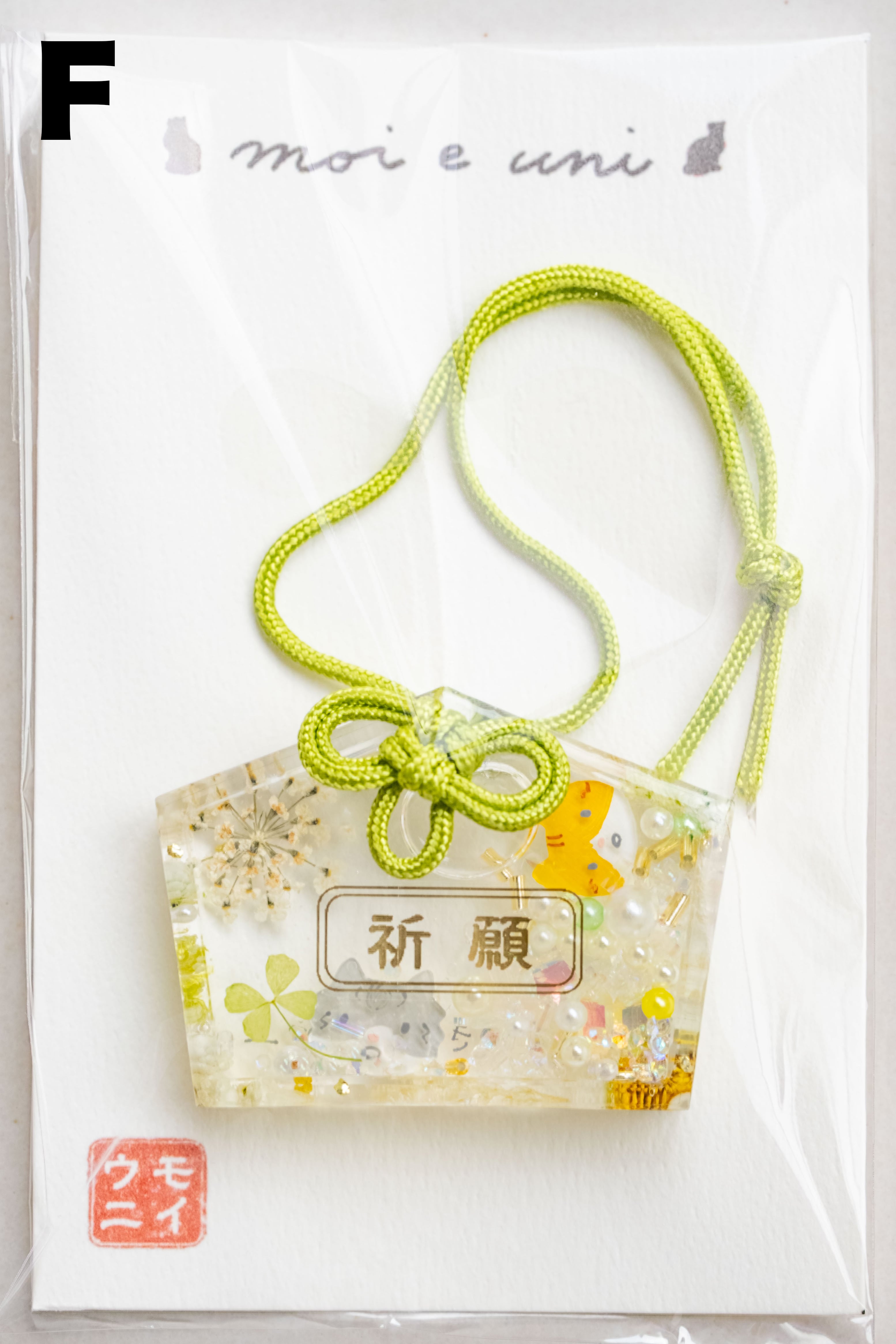 【絵馬型おまもい】表面に「祈願」、裏面に「うまくいきますよウニ」と書かれています。